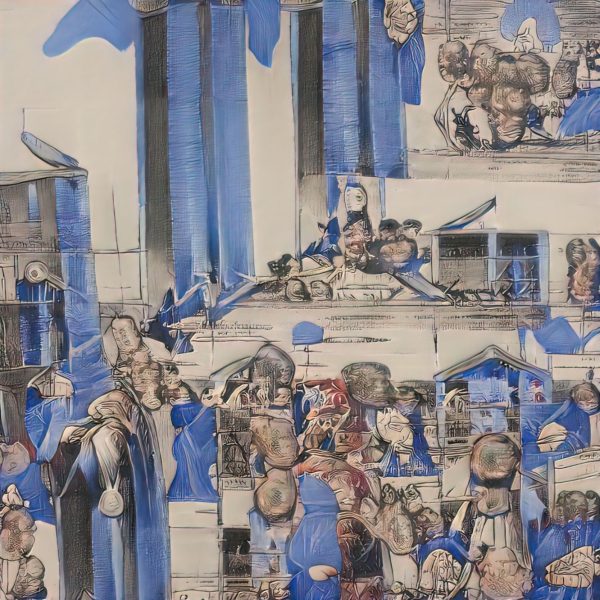 Dark, netlike, decorative grid of 2,755 slices of bologna consisting of a parklike respite from the tasks of viewing, judgment, and critique which is reminiscent of formal precision and tenderness
